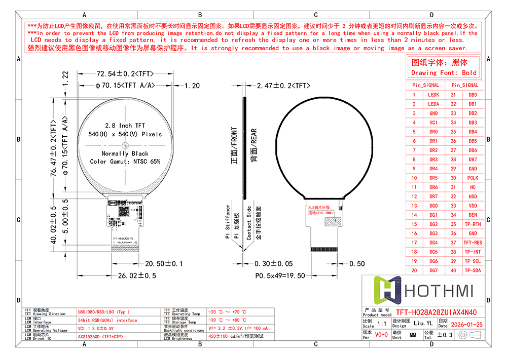 在结构方面,模组采用圆形设计,外径约76.47mm,显示区域直径70.15mm,背面配有PI加强板与SUS钢片补强,提升整体刚性。引脚为40Pin 0.5mm间距,适用于高密度连接设计。