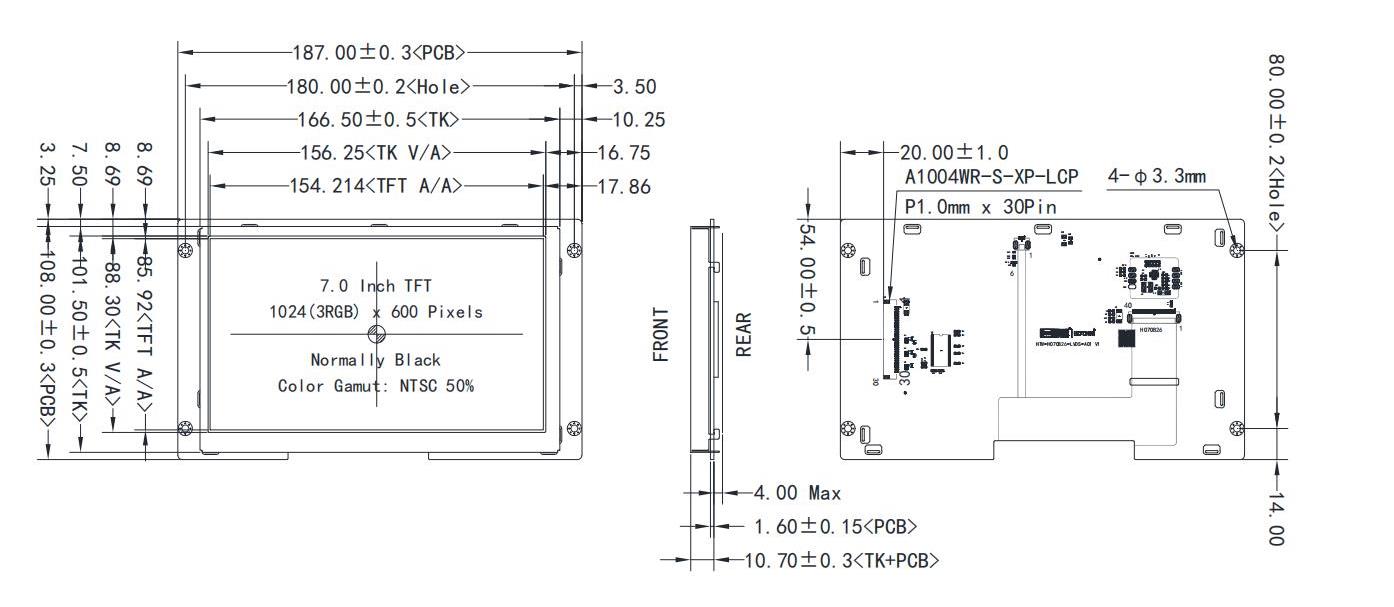 7.0”TFT 液晶显示屏模组/1024x600分辨率/宽温/IPS全视角/电容触摸/阳光下可读 HTM-H070A20-RGB-B06C TFT模组 1024x600 186.90x108x10.0 7.0 7.0 154.21x85.92 IPS全视角 500cd/m2 RGB 防静电ESD 8KV -30~80℃ 5.5 T.B.D