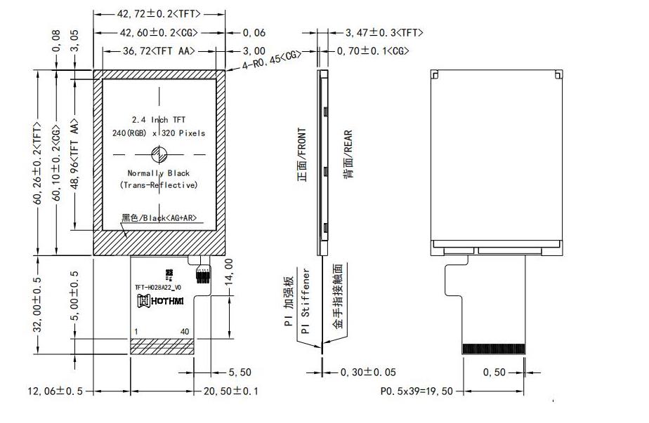 | 2.4寸防眩光显示屏-户外防反光显示屏 TFT-H024A22AVIST1G40 | TFT 显示屏 | 240x320 |